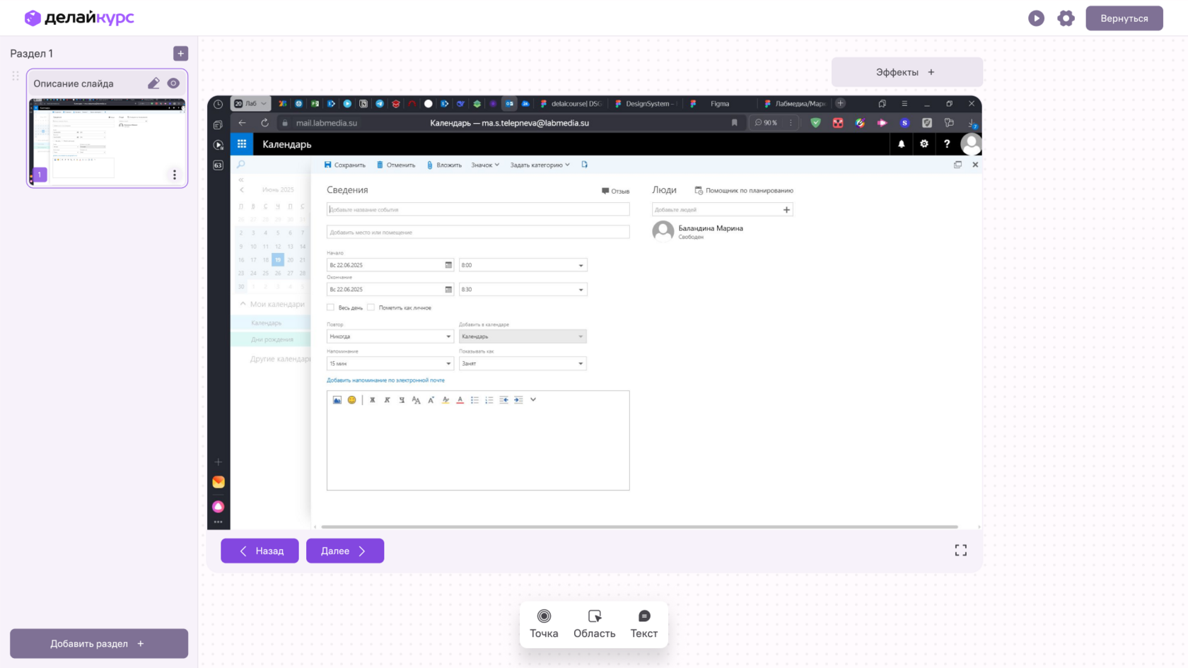 - Демонстрация: Позволяет создать пошаговую симуляцию работы с программным обеспечением. Выберите способ прохождения: по щелчку или по таймеру. Загрузите изображения и добавьте элементы, такие как точка, область, текст и описание.