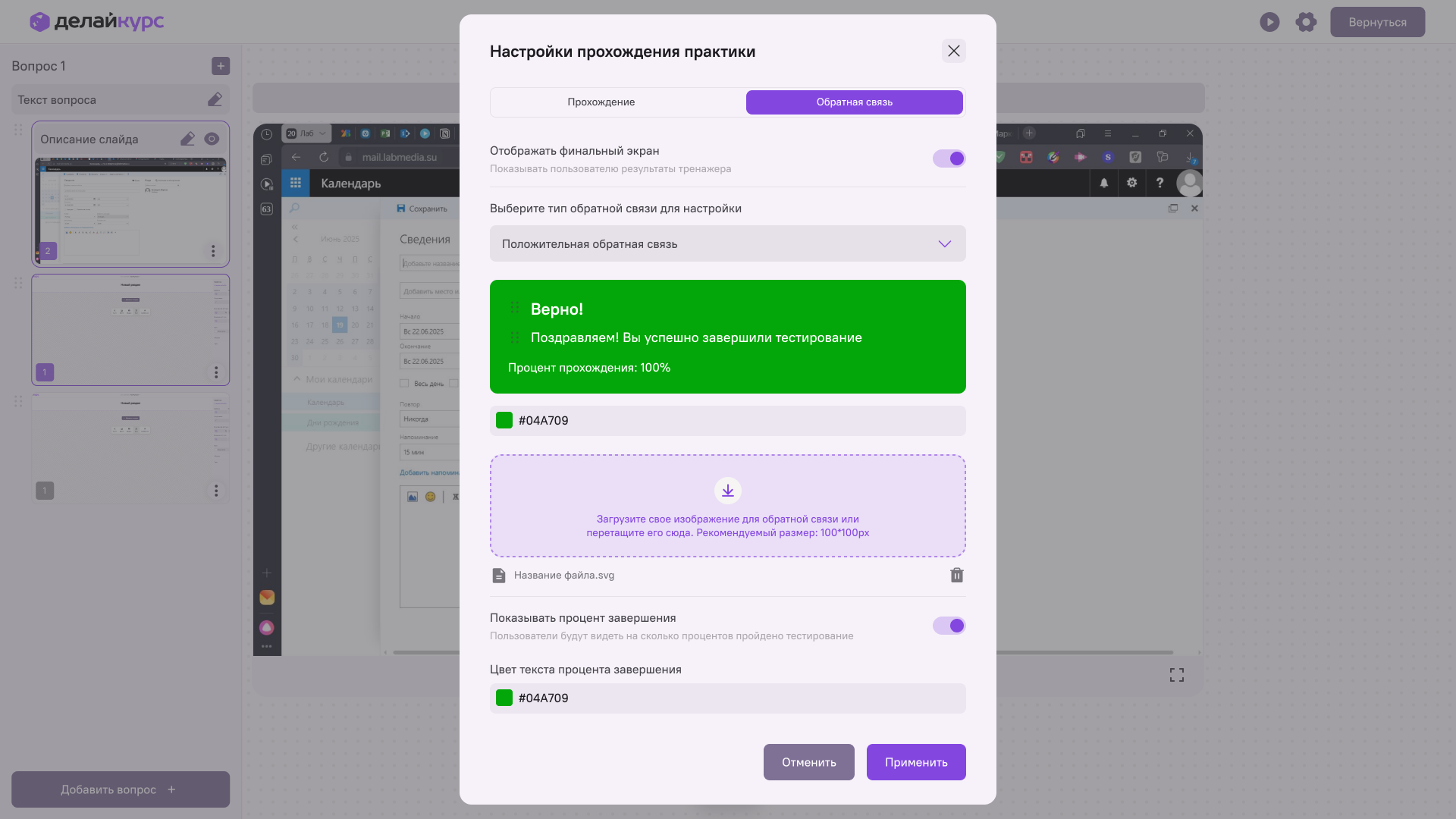 - Практика: Дает возможность применять знания на практических заданиях. Настройте вопросы, укажите верную область для ответа и добавьте обратную связь для правильных и неправильных ответов, а также финальную обратную связь.
