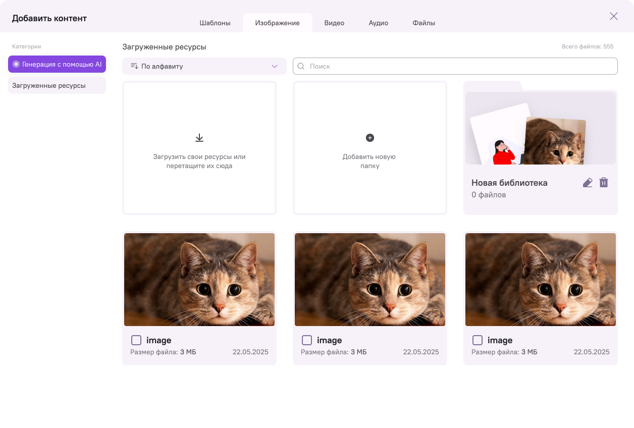 В электронном курсе теперь доступна функция организации ресурсов по папкам. Вы можете создать новую папку, указать её название и переместить или загрузить туда необходимые изображения, видео, аудио или файлы.